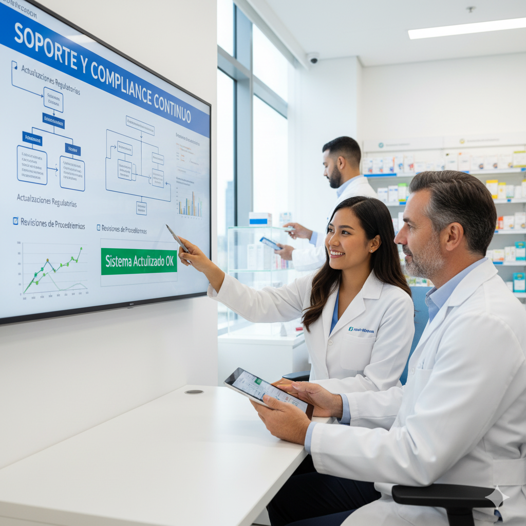 Nuestro compromiso no finaliza con la entrega del servicio. Ofrecemos un plan de acompañamiento y soporte técnico post-implementación para resolver dudas operativas, realizar ajustes de procedimientos y mantener actualizada su documentación frente a los constantes cambios del Marco Regulatorio Farmacéutico.