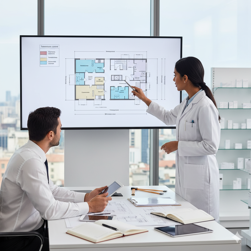 Asesoría especializada en el diseño físico (layout) de su botica o farmacia. Nos aseguramos de que la distribución del espacio, los flujos de trabajo y las áreas de almacenamiento cumplan cabalmente con las Buenas Prácticas y las especificaciones técnicas para la obtención de su licencia sanitaria.